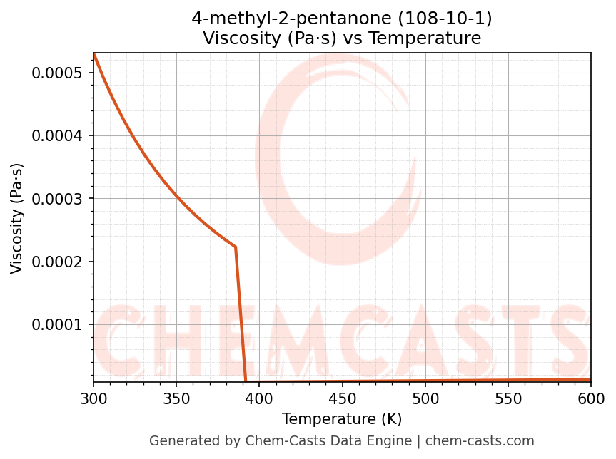 This page presents the temperature-dependent thermodynamic and transport properties of 4-methyl-2-pentanone (CAS 108-10-1) calculated at a constant pressure of 1 atm (101325 Pa) over the temperature range 250-500 K.