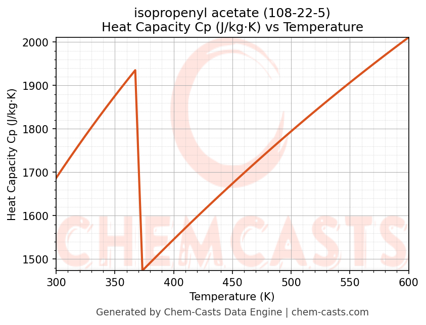 - Specific heat capacity (Cp) indicates the amount of energy required to raise the temperature of isopropenyl acetate and is critical for energy balance and heat-exchanger design.