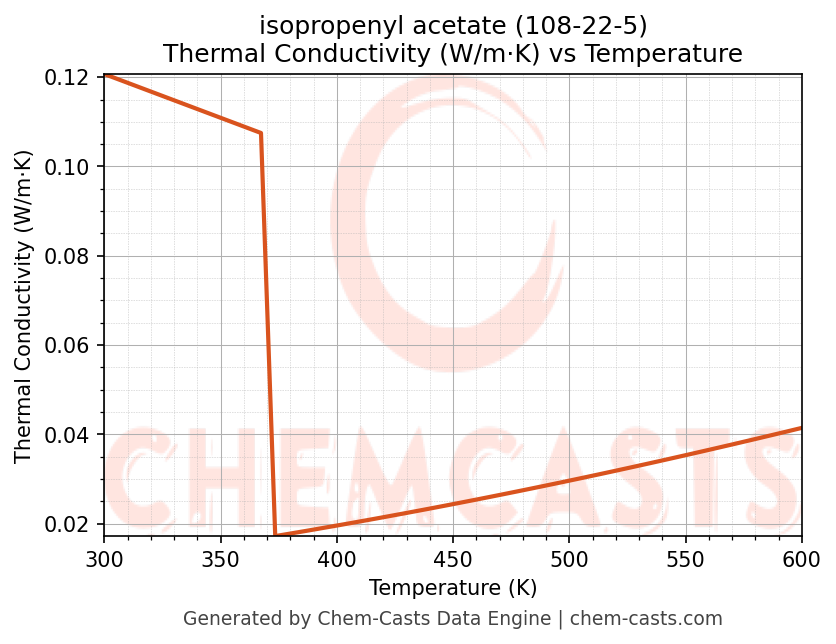 This page presents the temperature-dependent thermodynamic and transport properties of isopropenyl acetate (CAS 108-22-5) calculated at a constant pressure of 1 atm (101325 Pa) over the temperature range 250-500 K.