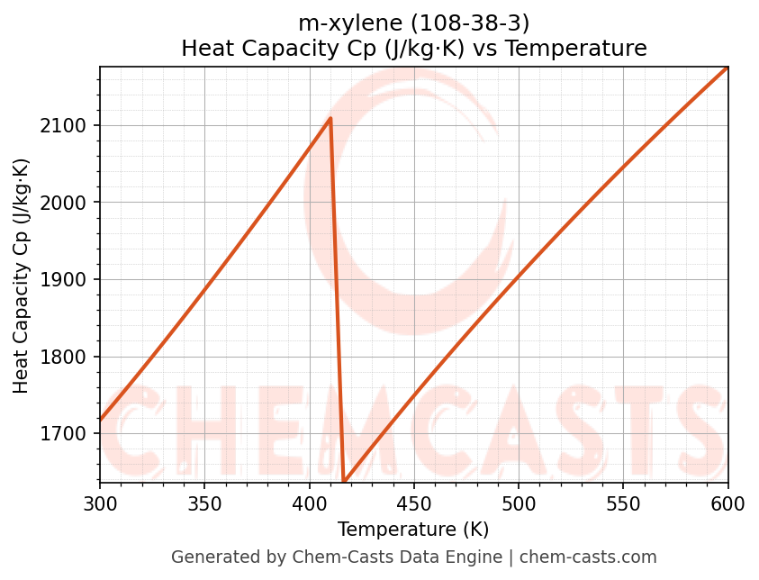 - Specific heat capacity (Cp) indicates the amount of energy required to raise the temperature of m-xylene and is critical for energy balance and heat-exchanger design.