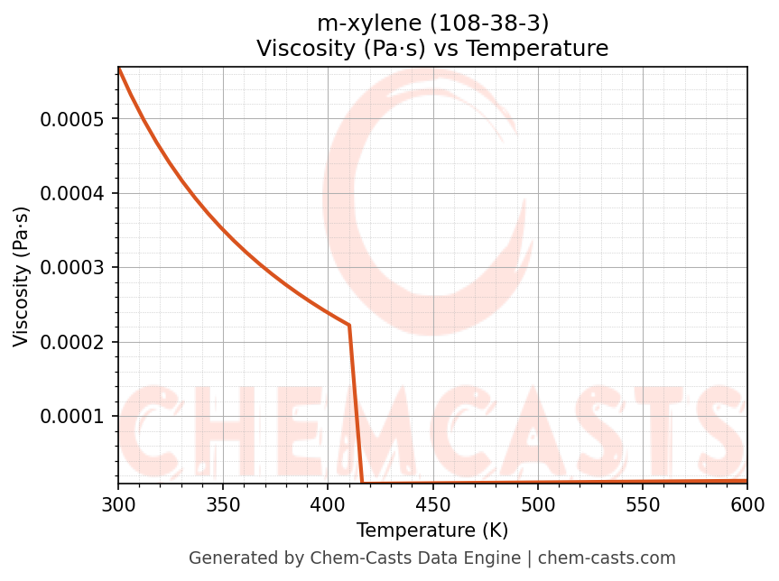 This page presents the temperature-dependent thermodynamic and transport properties of m-xylene (CAS 108-38-3) calculated at a constant pressure of 1 atm (101325 Pa) over the temperature range 250-500 K.