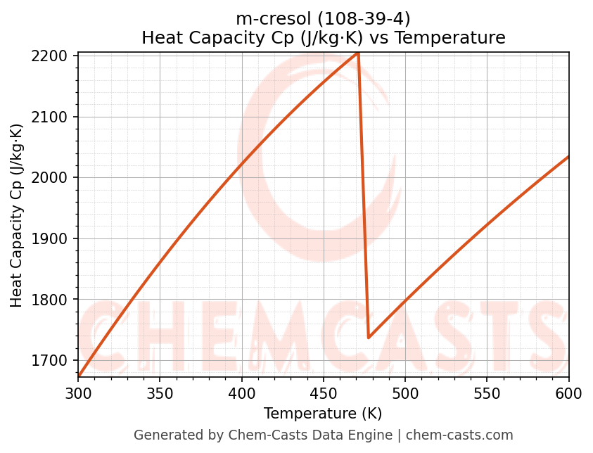 - Specific heat capacity (Cp) indicates the amount of energy required to raise the temperature of m-cresol and is critical for energy balance and heat-exchanger design.