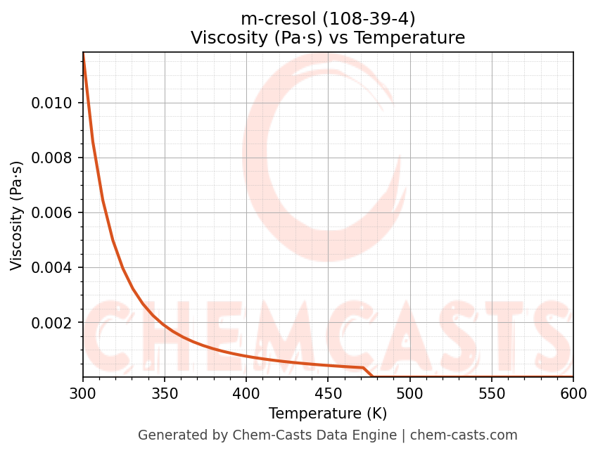 This page presents the temperature-dependent thermodynamic and transport properties of m-cresol (CAS 108-39-4) calculated at a constant pressure of 1 atm (101325 Pa) over the temperature range 250-500 K.