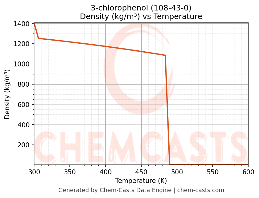 This page presents the temperature-dependent thermodynamic and transport properties of 3-chlorophenol (CAS 108-43-0) calculated at a constant pressure of 1 atm (101325 Pa) over the temperature range 250-500 K.