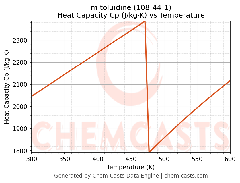 - Specific heat capacity (Cp) indicates the amount of energy required to raise the temperature of m-toluidine and is critical for energy balance and heat-exchanger design.