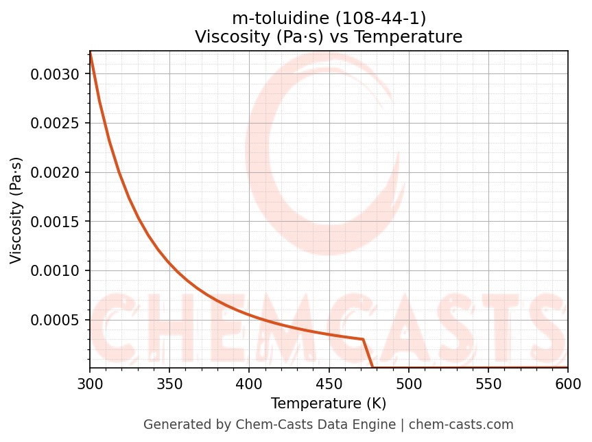 This page presents the temperature-dependent thermodynamic and transport properties of m-toluidine (CAS 108-44-1) calculated at a constant pressure of 1 atm (101325 Pa) over the temperature range 250-500 K.