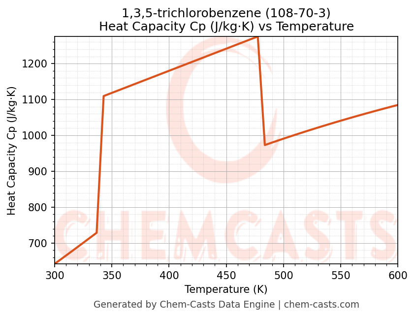 - Specific heat capacity (Cp) indicates the amount of energy required to raise the temperature of 1,3,5-trichlorobenzene and is critical for energy balance and heat-exchanger design.
