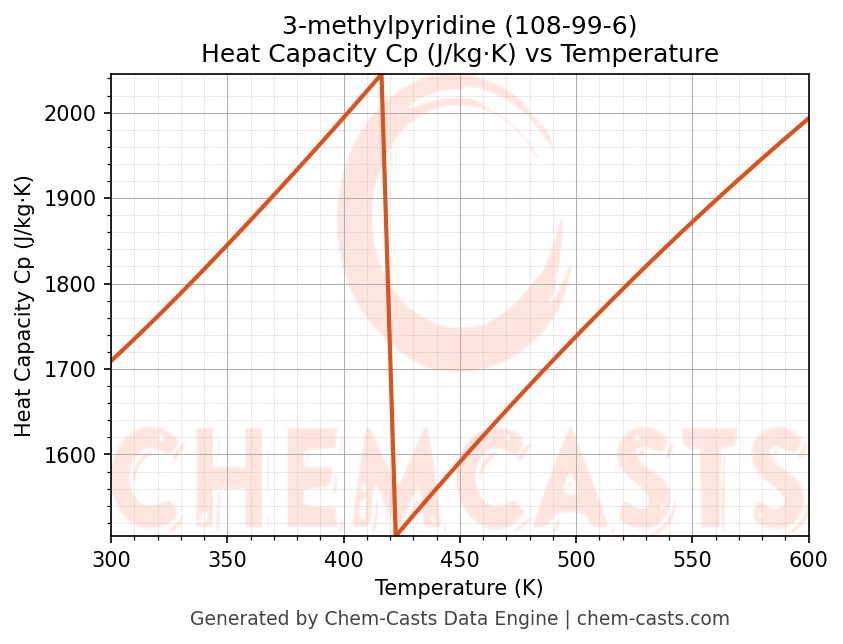 - Specific heat capacity (Cp) indicates the amount of energy required to raise the temperature of 3-methylpyridine and is critical for energy balance and heat-exchanger design.