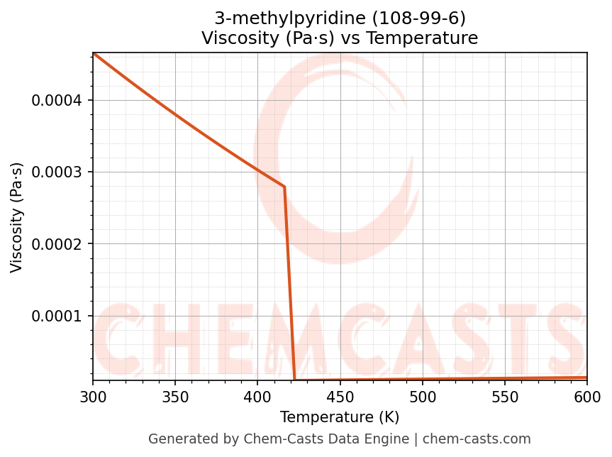 This page presents the temperature-dependent thermodynamic and transport properties of 3-methylpyridine (CAS 108-99-6) calculated at a constant pressure of 1 atm (101325 Pa) over the temperature range 250-500 K.