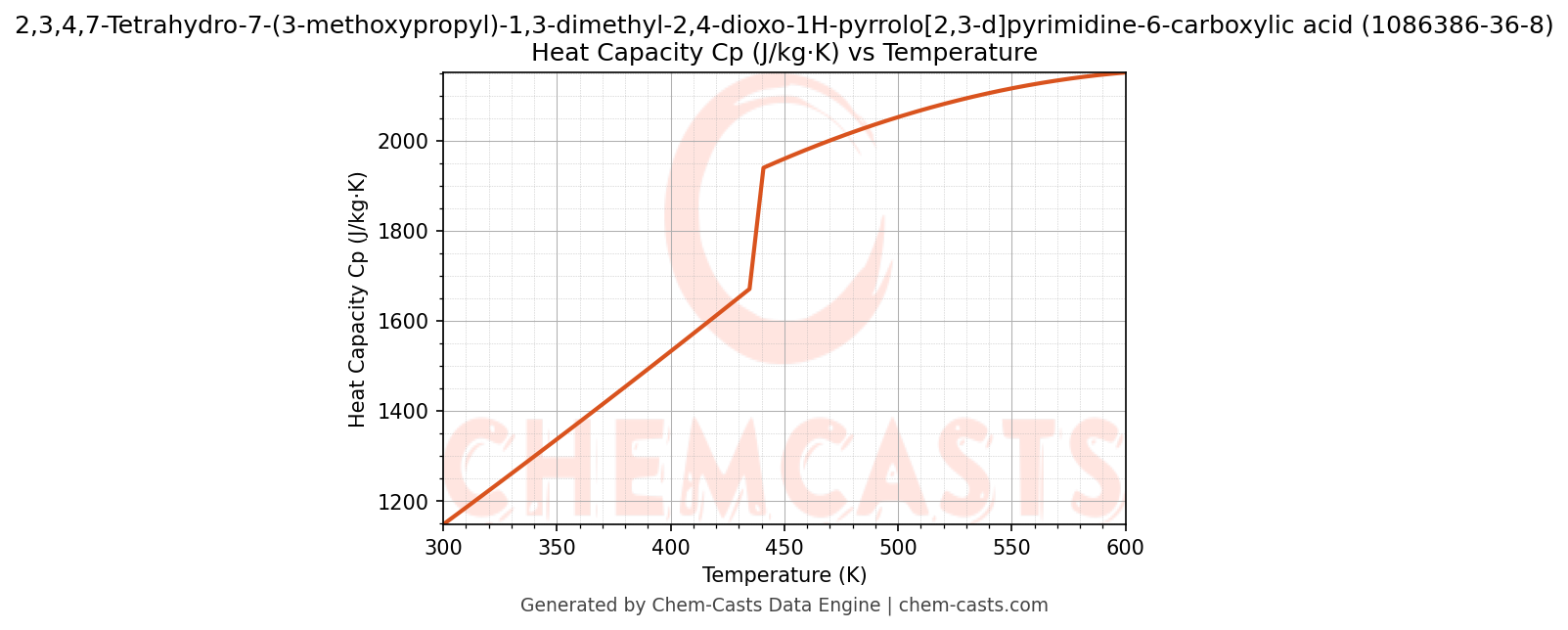 ![Heat Capacity (Cp) vs Temperature chart for 2,3,4,7-Tetrahydro-7-(3-methoxypropyl)-1,3-dimethyl-2,4-dioxo-1H-pyrrolo[2,3-d]pyrimidine-6-carboxylic acid (CAS 1086386-36-8)](https://chemcasts-prod.s3.ap-south-1.amazonaws.com/chem_plots_pconst/1086386-36-8-cp.png)