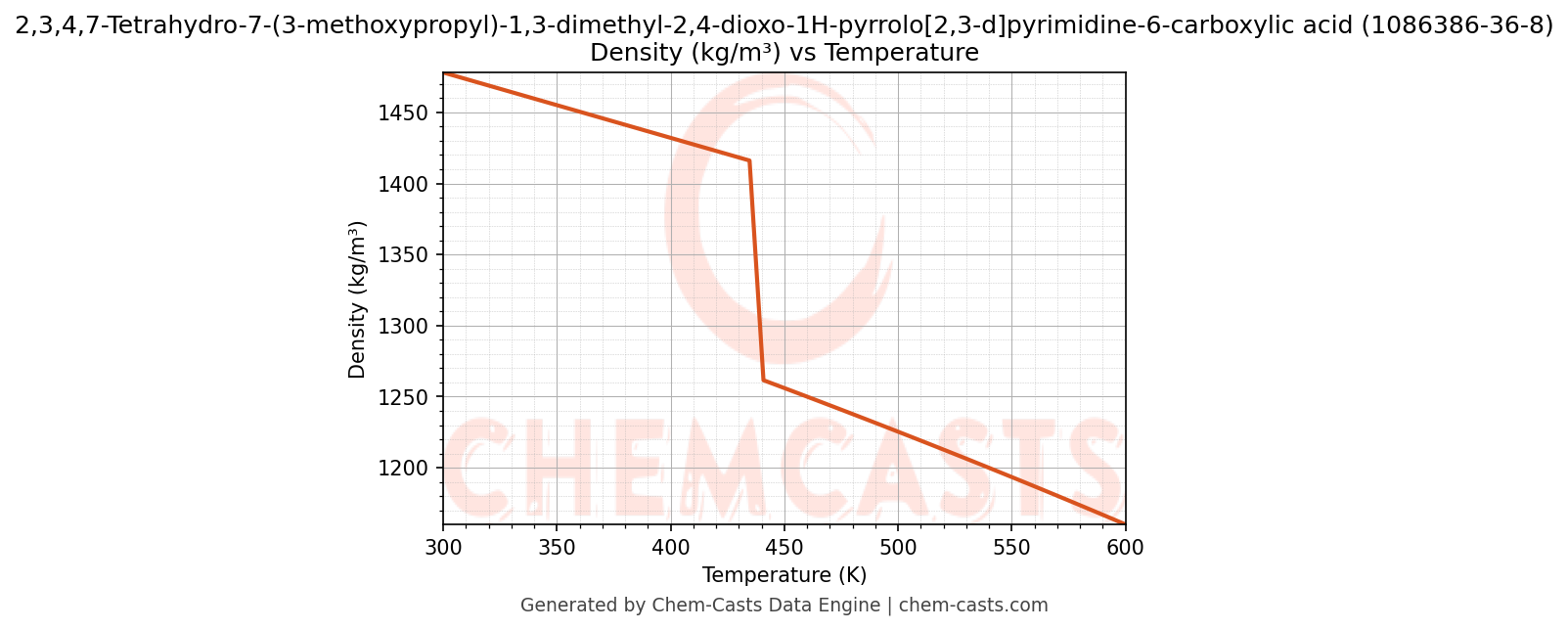 ![Density vs Temperature chart for 2,3,4,7-Tetrahydro-7-(3-methoxypropyl)-1,3-dimethyl-2,4-dioxo-1H-pyrrolo[2,3-d]pyrimidine-6-carboxylic acid (CAS 1086386-36-8)](https://chemcasts-prod.s3.ap-south-1.amazonaws.com/chem_plots_pconst/1086386-36-8-density.png)