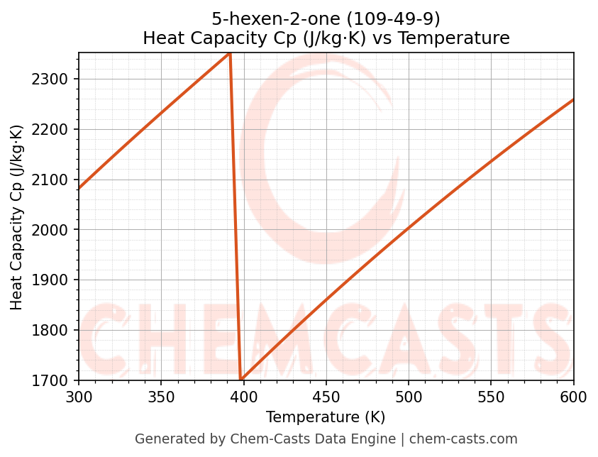 - Specific heat capacity (Cp) indicates the amount of energy required to raise the temperature of 5-hexen-2-one and is critical for energy balance and heat-exchanger design.