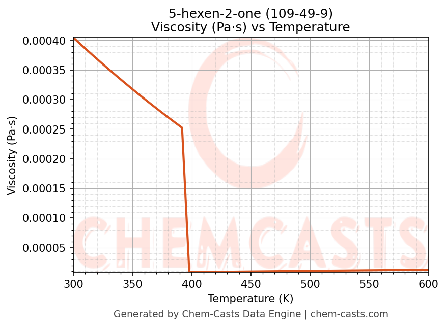 This page presents the temperature-dependent thermodynamic and transport properties of 5-hexen-2-one (CAS 109-49-9) calculated at a constant pressure of 1 atm (101325 Pa) over the temperature range 250-500 K.