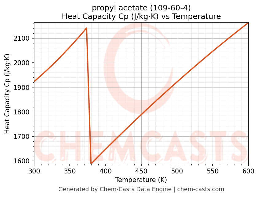 - Specific heat capacity (Cp) indicates the amount of energy required to raise the temperature of propyl acetate and is critical for energy balance and heat-exchanger design.