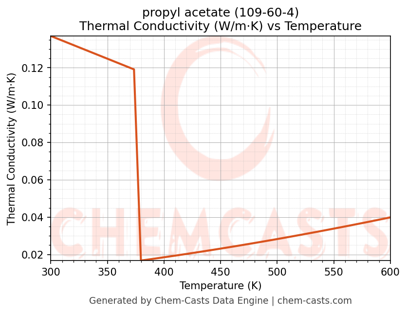 This page presents the temperature-dependent thermodynamic and transport properties of propyl acetate (CAS 109-60-4) calculated at a constant pressure of 1 atm (101325 Pa) over the temperature range 250-500 K.