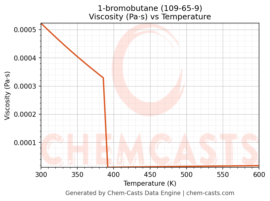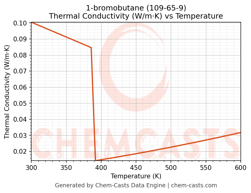 This page presents the temperature-dependent thermodynamic and transport properties of 1-bromobutane (CAS 109-65-9) calculated at a constant pressure of 1 atm (101325 Pa) over the temperature range 250-500 K.