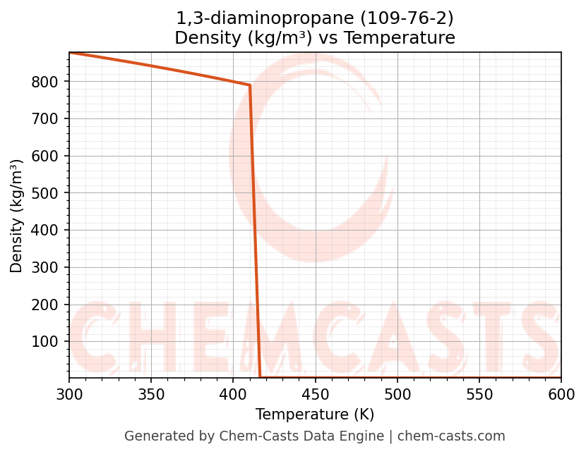 This page presents the temperature-dependent thermodynamic and transport properties of 1,3-diaminopropane (CAS 109-76-2) calculated at a constant pressure of 1 atm (101325 Pa) over the temperature range 250-500 K.
