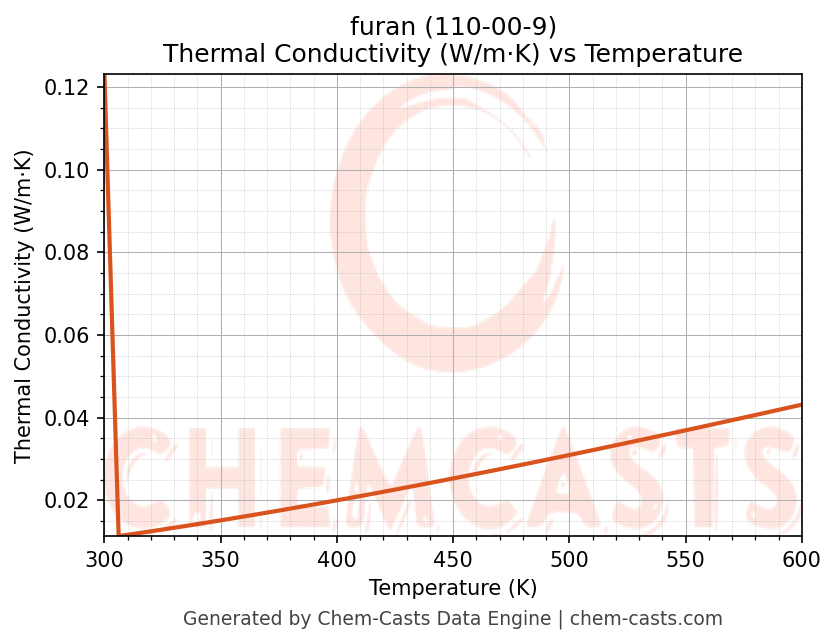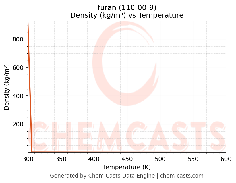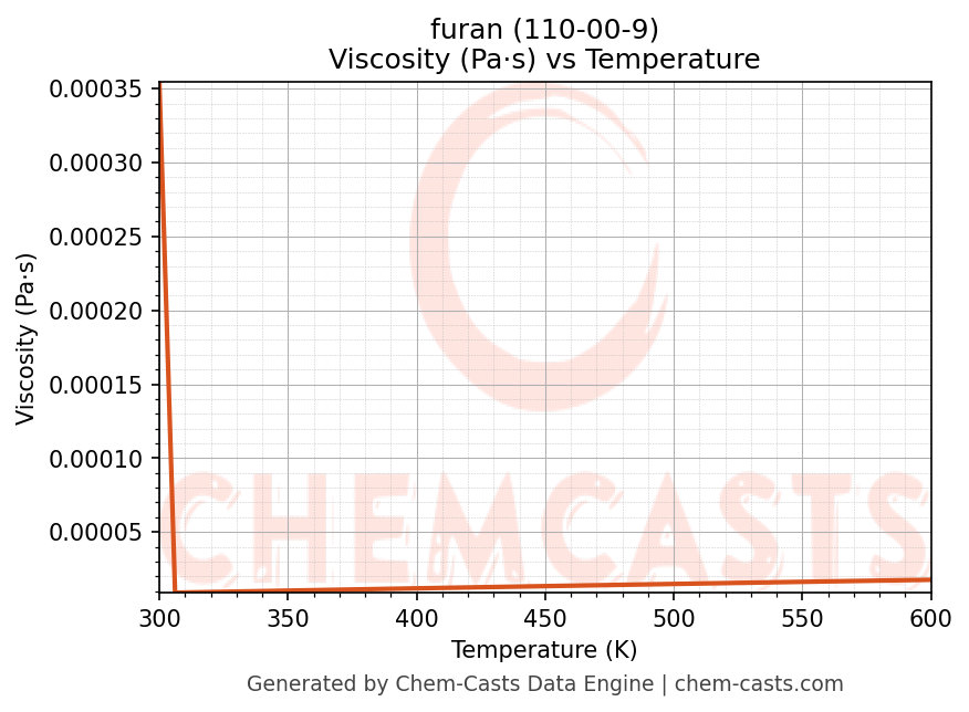 This page presents the temperature-dependent thermodynamic and transport properties of furan (CAS 110-00-9) calculated at a constant pressure of 1 atm (101325 Pa) over the temperature range 250-500 K.