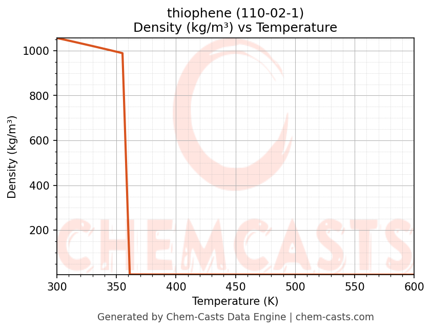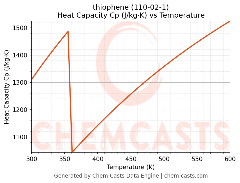 - Specific heat capacity (Cp) indicates the amount of energy required to raise the temperature of thiophene and is critical for energy balance and heat-exchanger design.