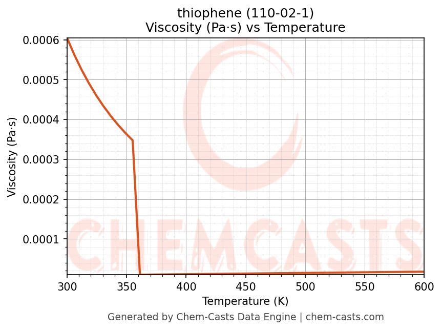 This page presents the temperature-dependent thermodynamic and transport properties of thiophene (CAS 110-02-1) calculated at a constant pressure of 1 atm (101325 Pa) over the temperature range 250-500 K.