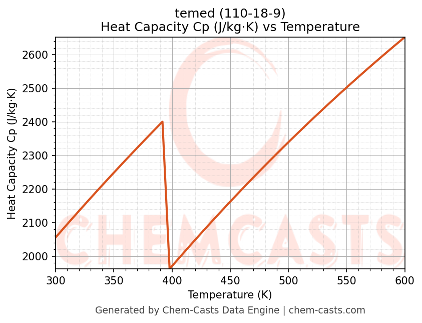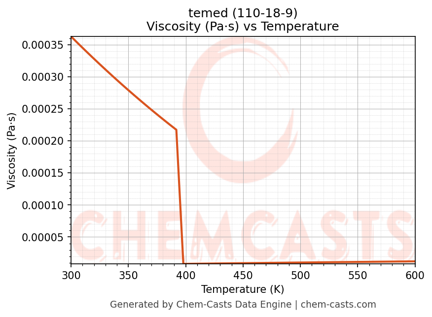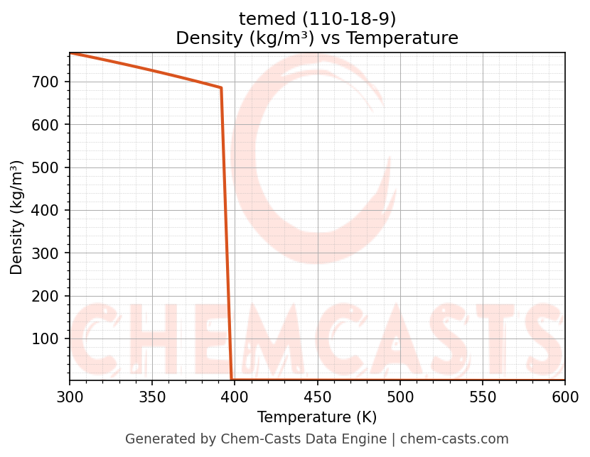 This page presents the temperature-dependent thermodynamic and transport properties of temed (CAS 110-18-9) calculated at a constant pressure of 1 atm (101325 Pa) over the temperature range 250-500 K.
