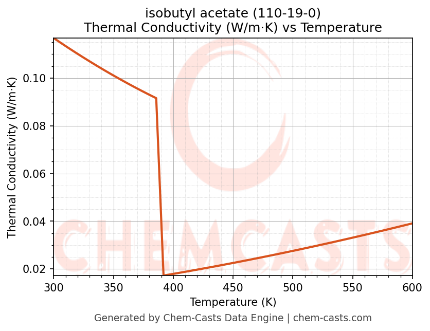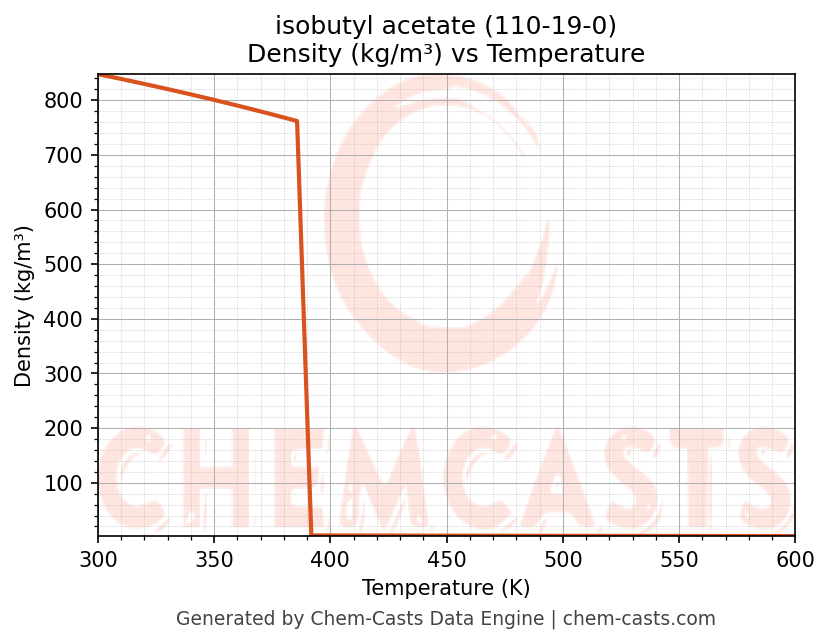 This page presents the temperature-dependent thermodynamic and transport properties of isobutyl acetate (CAS 110-19-0) calculated at a constant pressure of 1 atm (101325 Pa) over the temperature range 250-500 K.