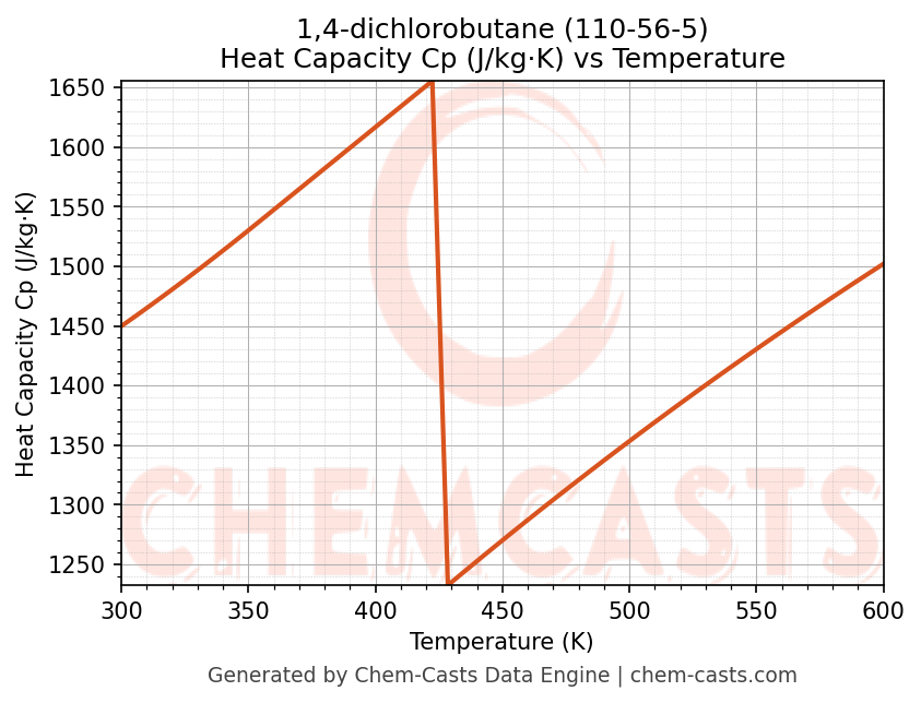 - Specific heat capacity (Cp) indicates the amount of energy required to raise the temperature of 1,4-dichlorobutane and is critical for energy balance and heat-exchanger design.
