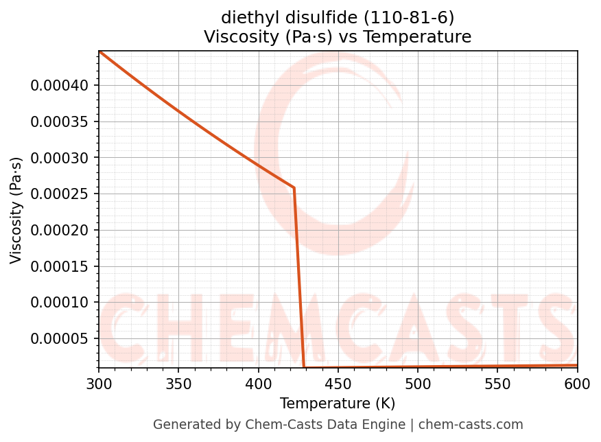 This page presents the temperature-dependent thermodynamic and transport properties of diethyl disulfide (CAS 110-81-6) calculated at a constant pressure of 1 atm (101325 Pa) over the temperature range 250-500 K.