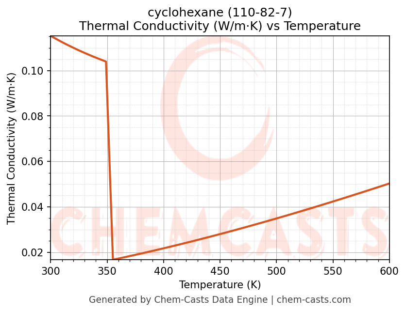 This page presents the temperature-dependent thermodynamic and transport properties of cyclohexane (CAS 110-82-7) calculated at a constant pressure of 1 atm (101325 Pa) over the temperature range 250-500 K.