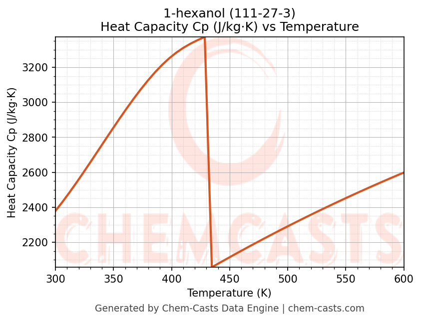 - Specific heat capacity (Cp) indicates the amount of energy required to raise the temperature of 1-hexanol and is critical for energy balance and heat-exchanger design.