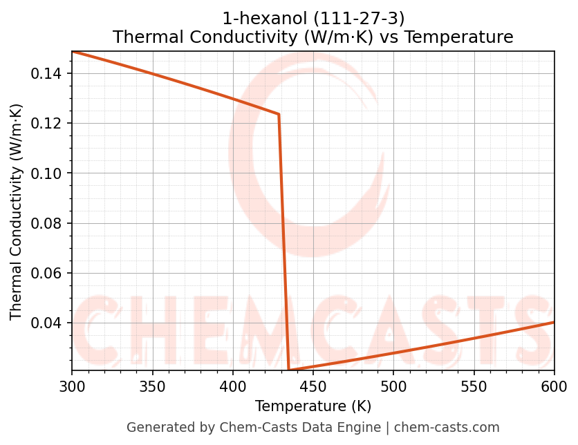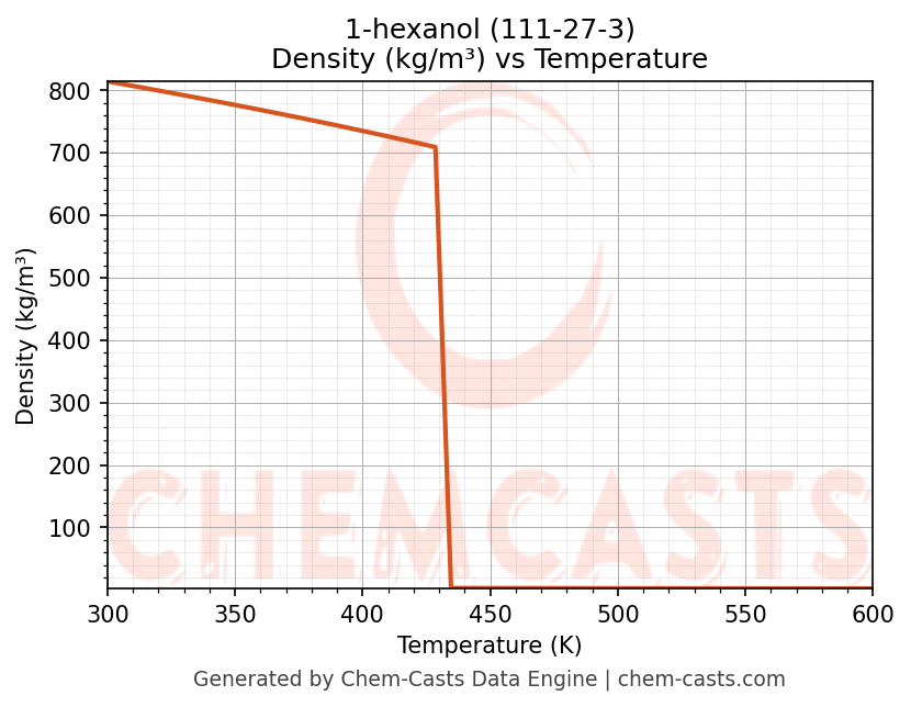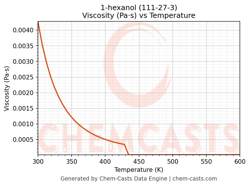 This page presents the temperature-dependent thermodynamic and transport properties of 1-hexanol (CAS 111-27-3) calculated at a constant pressure of 1 atm (101325 Pa) over the temperature range 250-500 K.