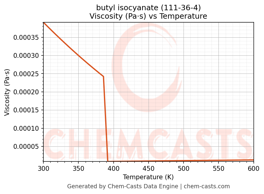 This page presents the temperature-dependent thermodynamic and transport properties of butyl isocyanate (CAS 111-36-4) calculated at a constant pressure of 1 atm (101325 Pa) over the temperature range 250-500 K.