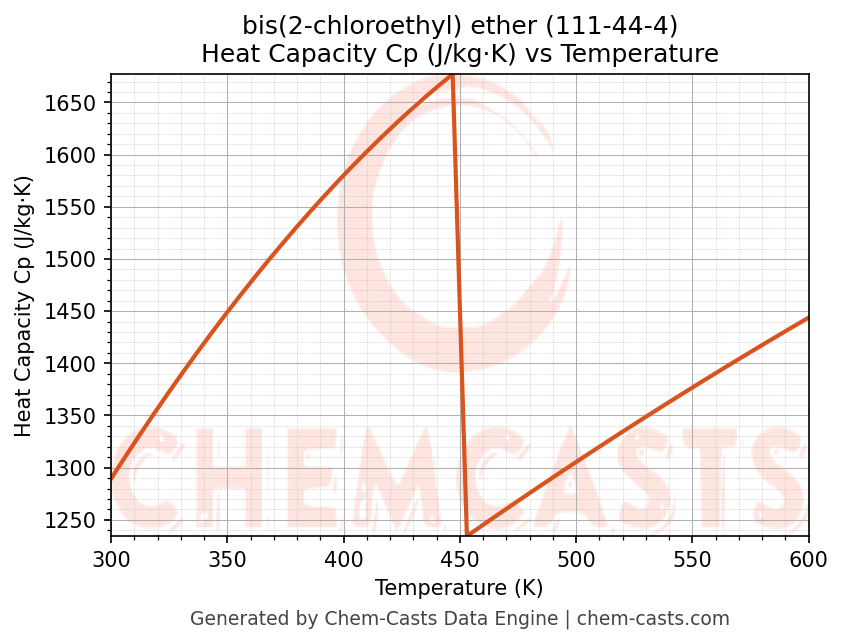 - Specific heat capacity (Cp) indicates the amount of energy required to raise the temperature of bis(2-chloroethyl) ether and is critical for energy balance and heat-exchanger design.