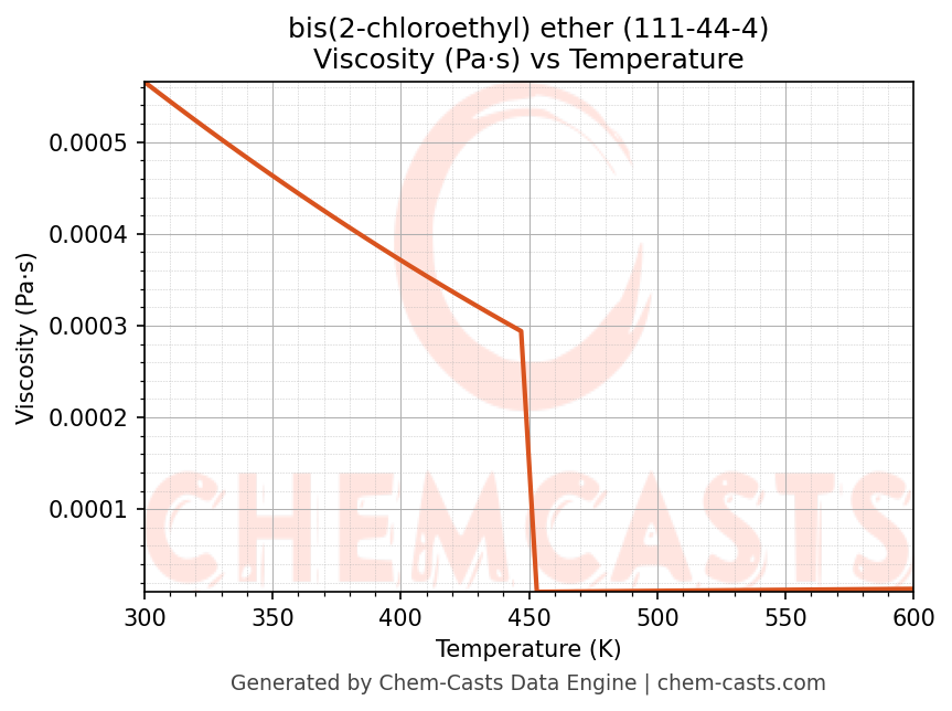 This page presents the temperature-dependent thermodynamic and transport properties of bis(2-chloroethyl) ether (CAS 111-44-4) calculated at a constant pressure of 1 atm (101325 Pa) over the temperature range 250-500 K.