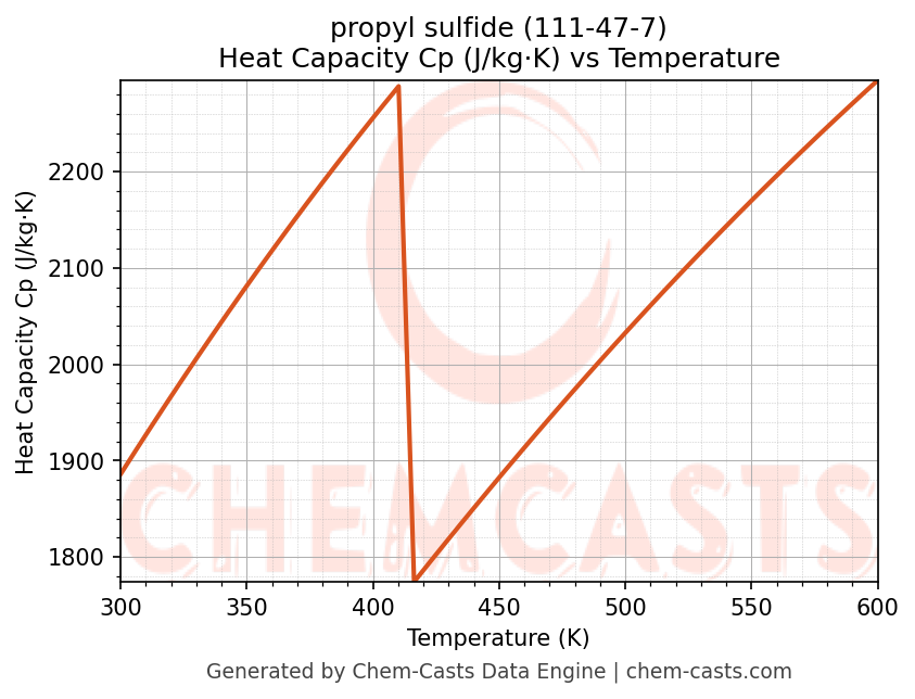 - Specific heat capacity (Cp) indicates the amount of energy required to raise the temperature of propyl sulfide and is critical for energy balance and heat-exchanger design.