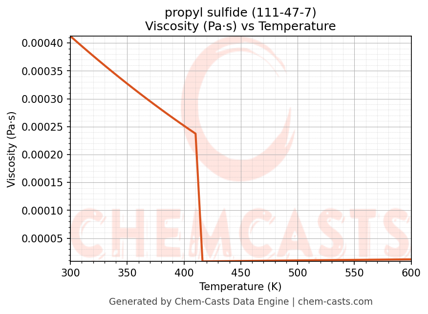 This page presents the temperature-dependent thermodynamic and transport properties of propyl sulfide (CAS 111-47-7) calculated at a constant pressure of 1 atm (101325 Pa) over the temperature range 250-500 K.