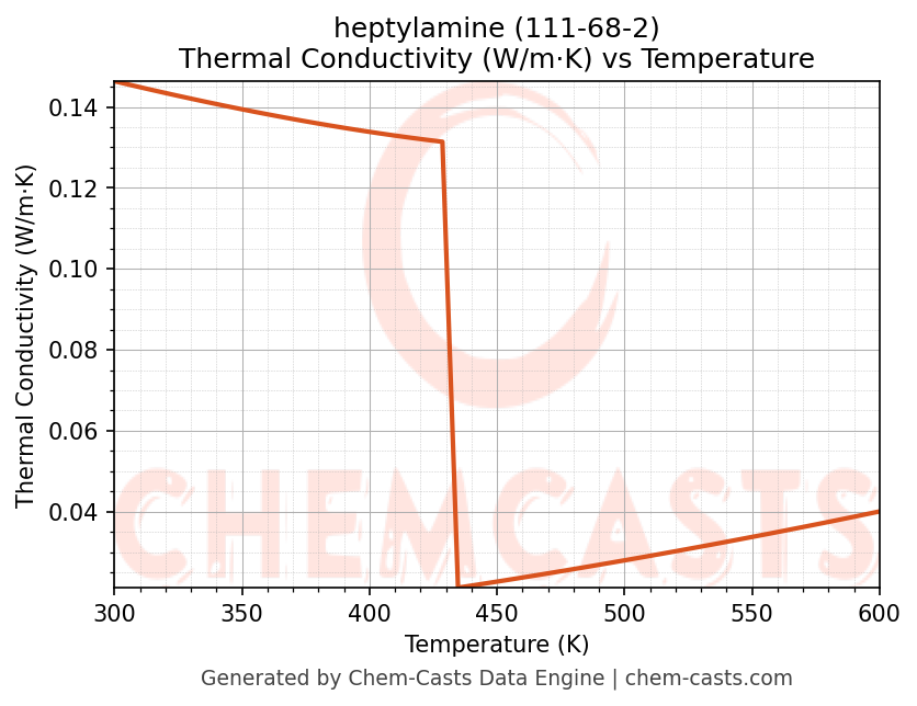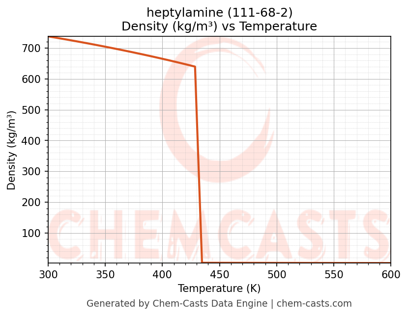 This page presents the temperature-dependent thermodynamic and transport properties of heptylamine (CAS 111-68-2) calculated at a constant pressure of 1 atm (101325 Pa) over the temperature range 250-500 K.