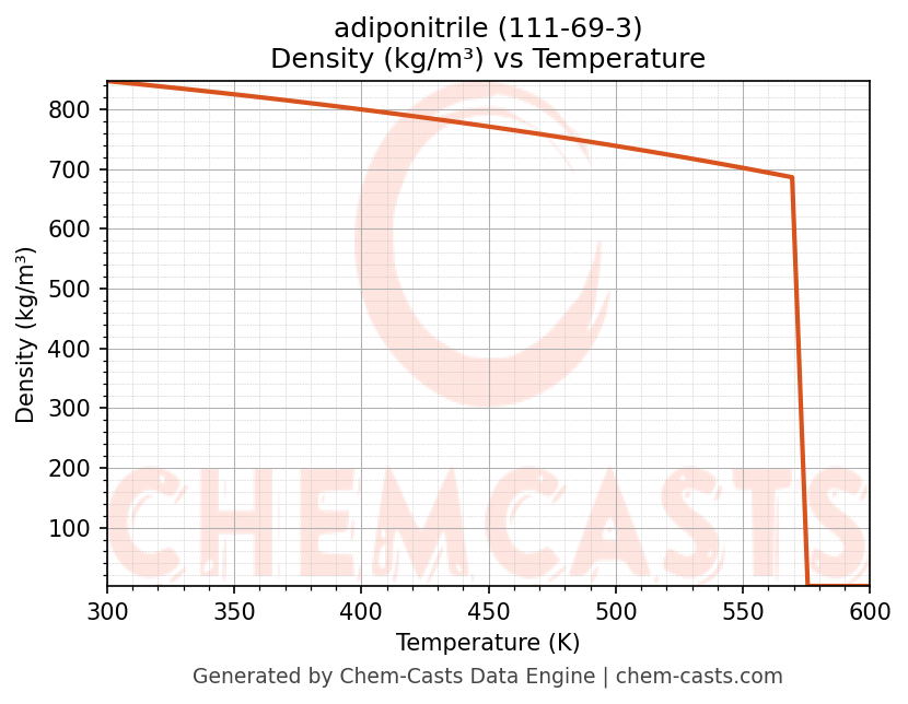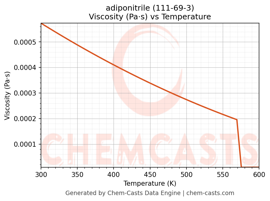 This page presents the temperature-dependent thermodynamic and transport properties of adiponitrile (CAS 111-69-3) calculated at a constant pressure of 1 atm (101325 Pa) over the temperature range 250-500 K.