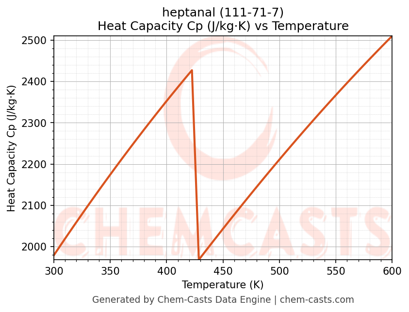 - Specific heat capacity (Cp) indicates the amount of energy required to raise the temperature of heptanal and is critical for energy balance and heat-exchanger design.