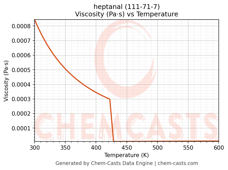 This page presents the temperature-dependent thermodynamic and transport properties of heptanal (CAS 111-71-7) calculated at a constant pressure of 1 atm (101325 Pa) over the temperature range 250-500 K.