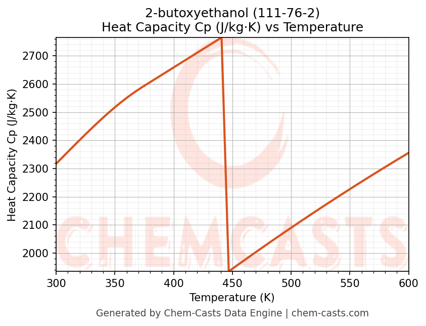 - Specific heat capacity (Cp) indicates the amount of energy required to raise the temperature of 2-butoxyethanol and is critical for energy balance and heat-exchanger design.