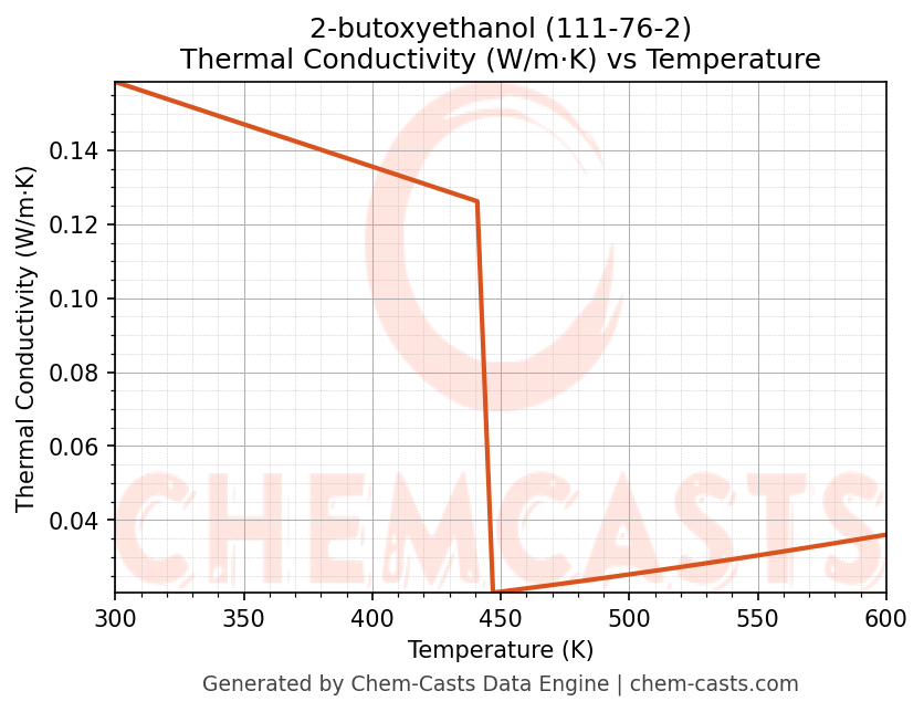 This page presents the temperature-dependent thermodynamic and transport properties of 2-butoxyethanol (CAS 111-76-2) calculated at a constant pressure of 1 atm (101325 Pa) over the temperature range 250-500 K.