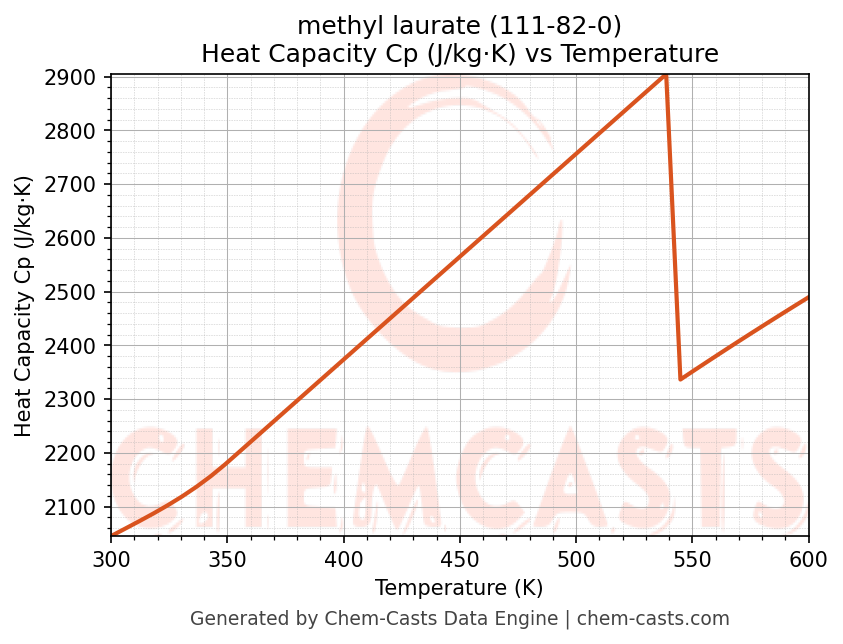- Specific heat capacity (Cp) indicates the amount of energy required to raise the temperature of methyl laurate and is critical for energy balance and heat-exchanger design.
