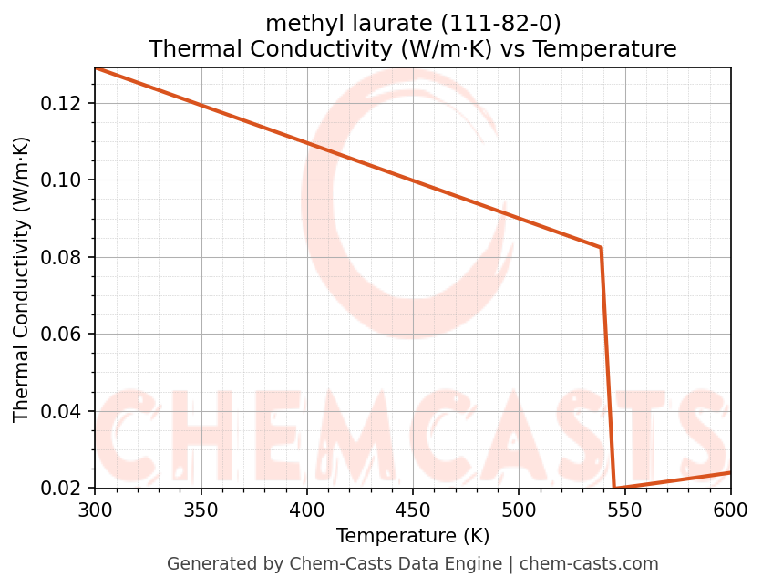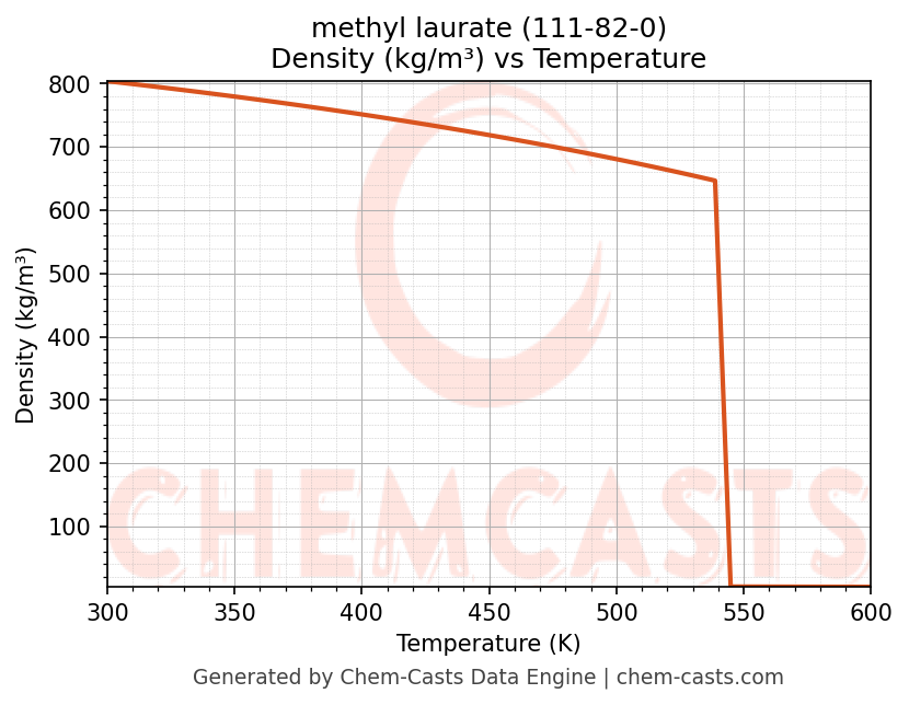 This page presents the temperature-dependent thermodynamic and transport properties of methyl laurate (CAS 111-82-0) calculated at a constant pressure of 1 atm (101325 Pa) over the temperature range 250-500 K.