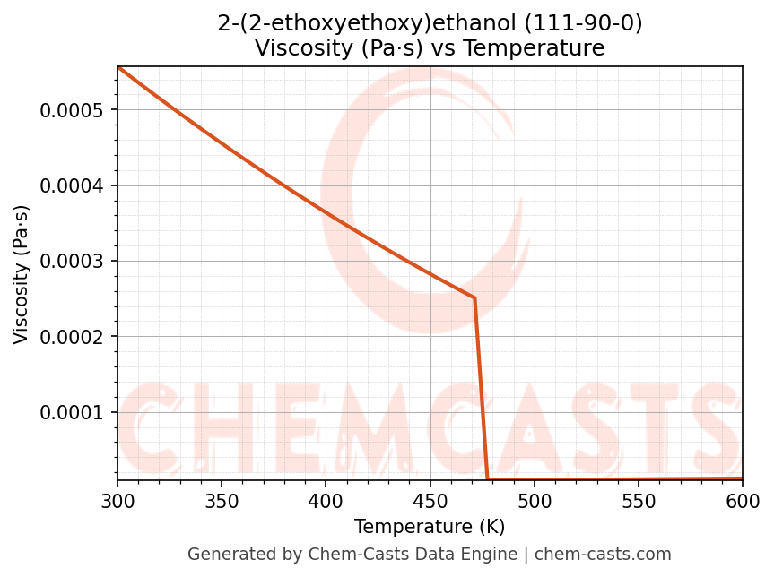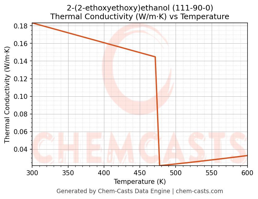 This page presents the temperature-dependent thermodynamic and transport properties of 2-(2-ethoxyethoxy)ethanol (CAS 111-90-0) calculated at a constant pressure of 1 atm (101325 Pa) over the temperature range 250-500 K.
