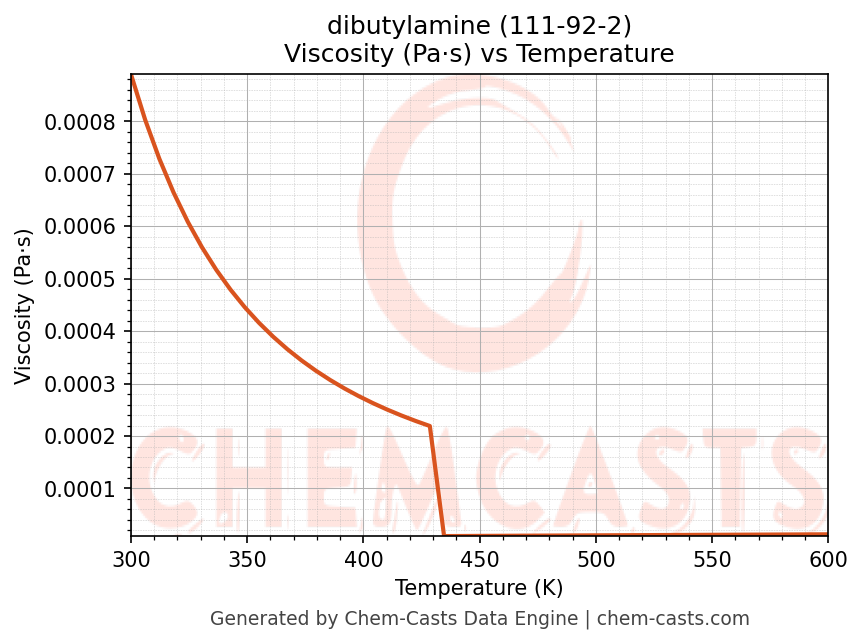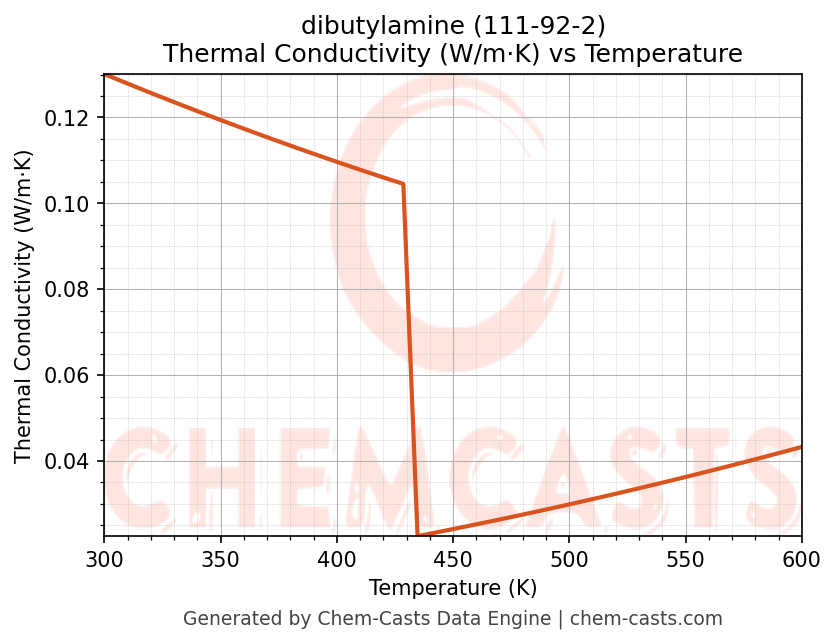 This page presents the temperature-dependent thermodynamic and transport properties of dibutylamine (CAS 111-92-2) calculated at a constant pressure of 1 atm (101325 Pa) over the temperature range 250-500 K.