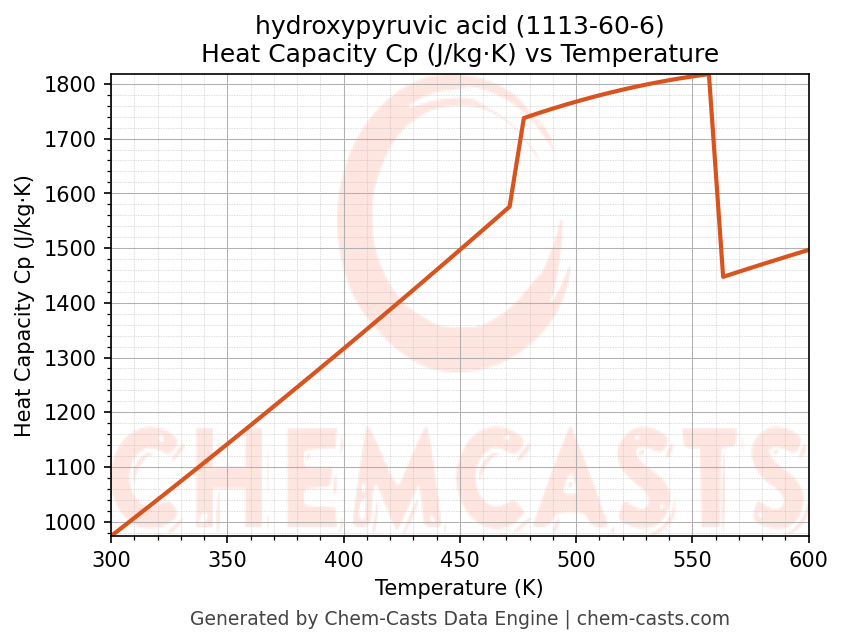- Specific heat capacity (Cp) indicates the amount of energy required to raise the temperature of hydroxypyruvic acid and is critical for energy balance and heat-exchanger design.