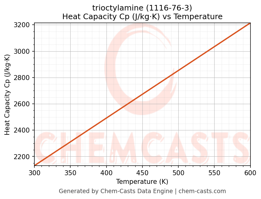 - Specific heat capacity (Cp) indicates the amount of energy required to raise the temperature of trioctylamine and is critical for energy balance and heat-exchanger design.