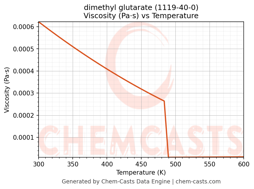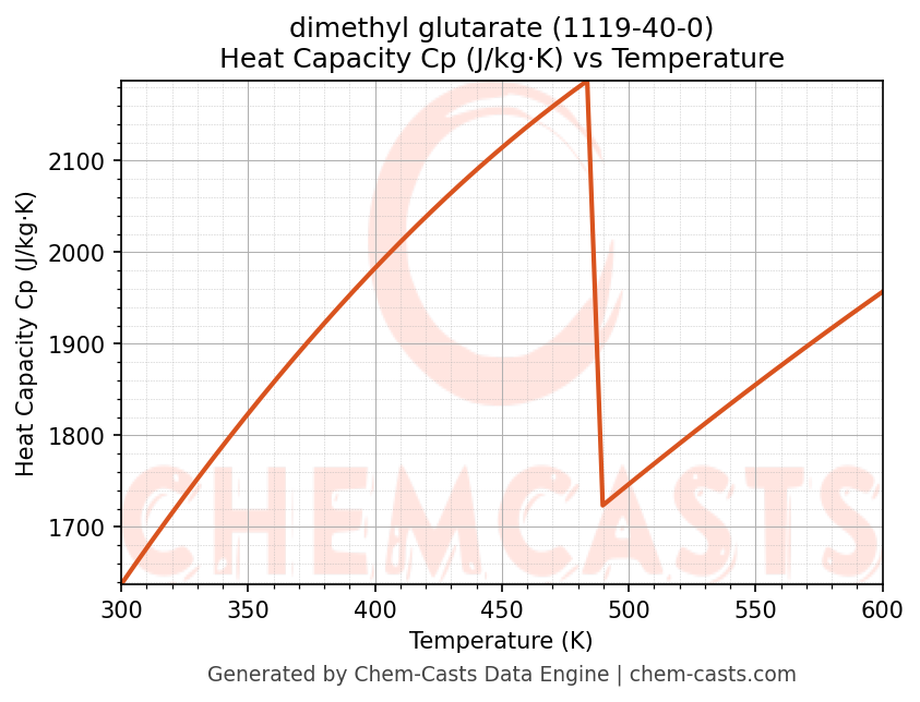 This page presents the temperature-dependent thermodynamic and transport properties of dimethyl glutarate (CAS 1119-40-0) calculated at a constant pressure of 1 atm (101325 Pa) over the temperature range 250-500 K.