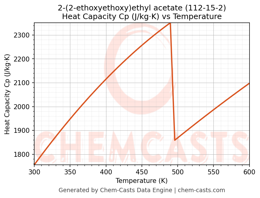 - Specific heat capacity (Cp) indicates the amount of energy required to raise the temperature of 2-(2-ethoxyethoxy)ethyl acetate and is critical for energy balance and heat-exchanger design.